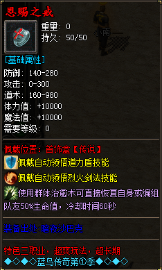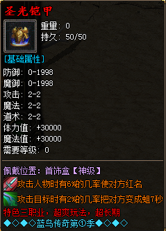 装备一共分为7个品质:劣质,普通,稀有,巧工,完美,史诗,神赐!品质越高属性增加越多,词条数越多,品质不满意的装备都可以在盟重NPC进行升级和重置